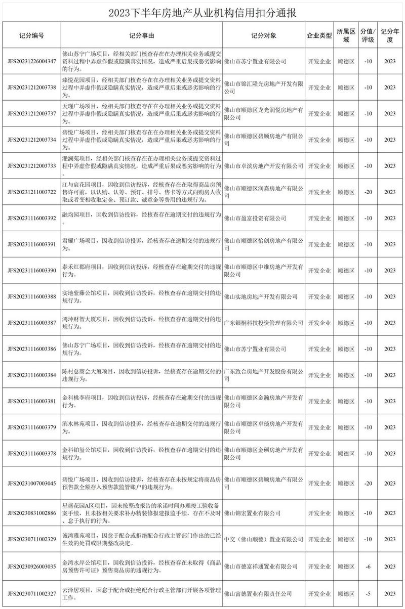 记者从佛山市顺德区住房城乡建设和水利局获悉,该局近日通报顺德区2023年下半年房地产行业信用信息诚信记分情况,21家开发企业因存在违规或影响恶劣行为,被依法诚信扣分。