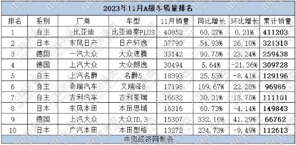11月,丰田系在A级车市场遭遇挫折,卡罗拉和雷凌分别销售9641辆和7442辆,同环比均出现两位数以上的下滑,双双跌出榜单。有业内人士表示,“随着自主品牌在纯电和插电式混动市场的发力,丰田系油电混动车型市场份额逐渐收缩。”