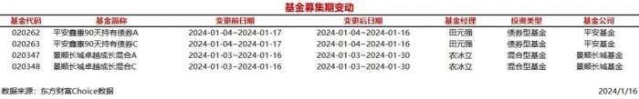 南方财经1月16日电,据东方财富Choice数据统计,今日共有4只基金公告募集期变动(A/C类分开计算);其中,2只基金提前结束募集,2只基金延长募集。